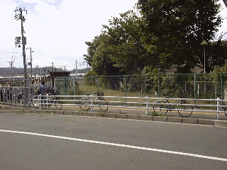 | JR鷹取駅南。西方向から地平に降りてくる専用線跡を発見。奇麗に芝刈りされていました。 | 左の写真の奥,高架の切り崩された跡を上る西君。危険なことは止めましょう(^_^;)。 |