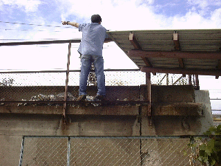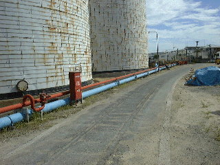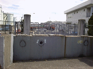 | 分岐した専用線の一つは工場の塀の中。塀をよじ登ってみると,線路跡がくっきり。 | 専用線の先は工場の中へ。 |