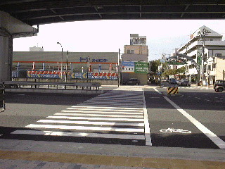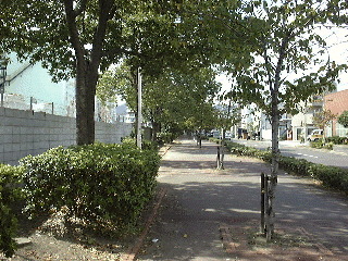 | 広い2号線を渡る線路跡は横断歩道の部分。ホームセンター右の建物の幅が線路跡。 | もう一方の分岐した専用線は歩道に変わっていました。 |