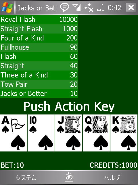 W-ZERO3[es]を買ったので、試しにポーカーを作ってみました。とりあえず9/6のJacks or Betterです。