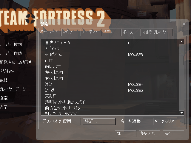 Team Fortress 2を起動し、「設定」を選んで「キーボード」タブを表示すれば、新たな拡張項目を含んだキーボード設定を行うことが出来ます。