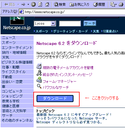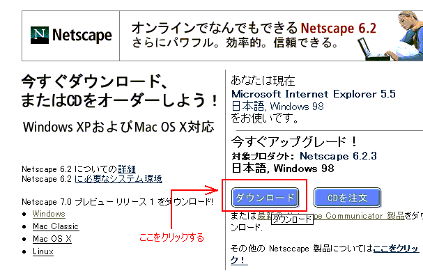 ネットスケープのサイト http://www.netscape.co.jp/ まで行きDLするのですが、分かりにくいという人向けに画像を用意しましたので参考にして下さい。ちなみにネスケをDLするにはブラウザの JavaScriptを有効にしていないといけませんので注意して下さい。