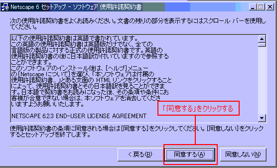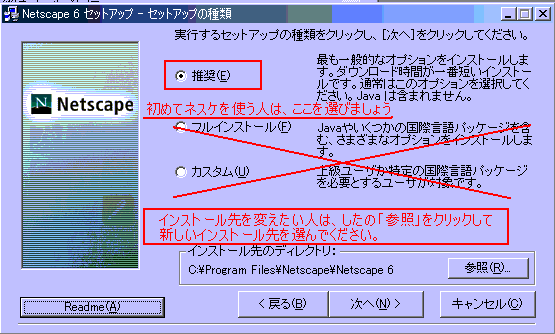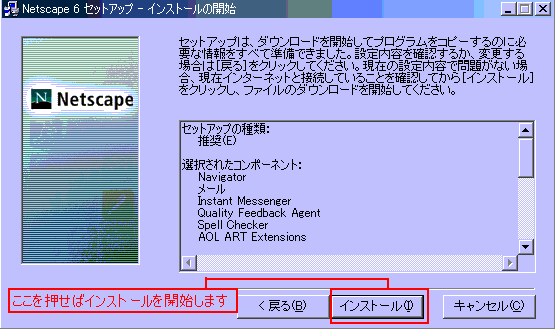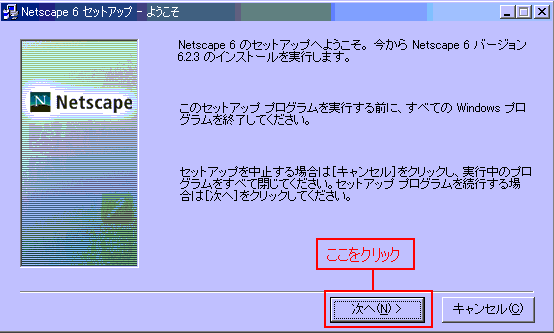 ええっ!?「Oh No!」ってこっちが言いたいぐらいです。しかも赤ちゃんの顔が何か癪に障るし。それにしても公式サイトでネスケがDLできないとは前途多難ですが、気合を入れていきましょう。ちなみにこのような表示が出るのは私の環境だけでしょうか?DLがきちんと出来た人は、その実行ファイルをダブルクリックすればNetscapeのインストールが始まります。