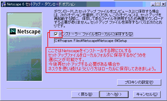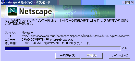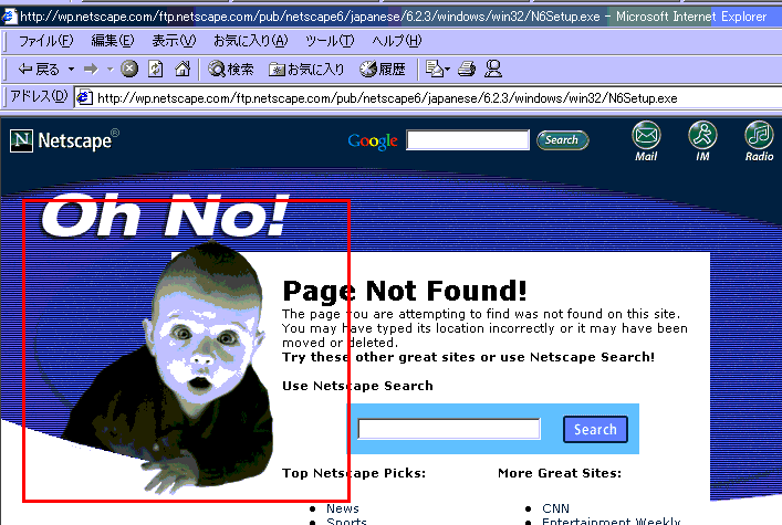 ぐたぐた言っていてもしょうがないので、他のDLサイトを探すことに。赤ちゃんが「Oh No!」と叫んでいるページのアドレスを見てみると、http://wp.netscape.com/ftp.netscape.com/pub/netscape6/japanese/6.2.3/windows/win32/N6Setup.exe となっていますが、よーくアドレスを見ると http://wp.netscape.com/ftp.netscape.com/pub/netscape6/japanese/6.2.3/windows/win32/N6Setup.exe どうやらFTPサイトからDLするみたいです。という事でアドレスをいじってみてこのようにしてみました。といっても先頭にftp://をつけただけですが。 ftp://ftp.netscape.com/pub/netscape6/japanese/6.2.3/windows/win32/N6Setup.exe