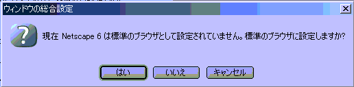 これが終わると次に出てくるのは下にあるウィンドウで要約すると「IEよりNetscapeを使え」という意味です。「ネットスケープはテスト的に使ってみて、気に入ったら本格的に使う」とか「ネットスケープを今後使う気は無いが、どんなプラウザか気になる」という方は「いいえ」を押して下さい。それ以外の方で「IEなんか使えるか!」と語尾にびっくりマークが入るぐらいIEが嫌いな方は「はい」を押してください。