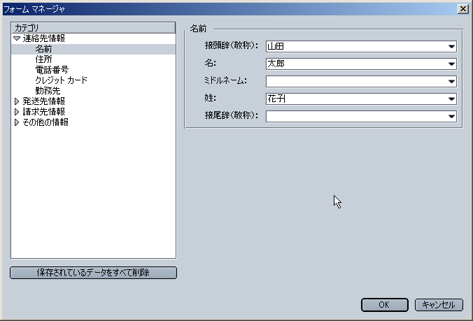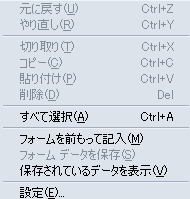 ここで「元に戻す」から「削除」までは半透明になっており、通常は仕様不可です。こいつは上で説明した「ページの編集」の時に使う機能なので今は無視。ここで気になる「フォームに前もって記入」「フォームデータを保存」「保存されているデータを表示」の三つから説明します。これは個人情報を記入する際に、個人情報の記入を助けてくれる機能で、前もって名前や住所などを設定しておくことにより、ボタン一つで自動的に名前などを記入してくれる機能です。