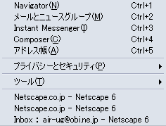 「メールとニュースグループ」 Netscapeのメーラーを開くみたいですが、今使っているメーラーで十分ですのでわざわざ乗り換える必要はないかと。ただ使いにくいとか、機能的に劣っているという訳ではないので「今はOutlookを使っているけど他のメーラーに乗り換えたい、けど鶴亀やBecky!!はシェアなので使えない」という方などはこれを気に乗り換えてみてはどうでしょうか。