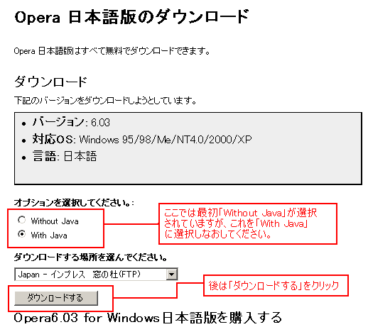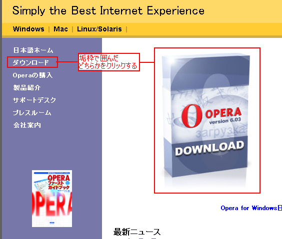 まずはOperaの公式サイト http://www.jp.opera.com/ に行き、ファイルをDLしましょう。(ちなみに最初「Operaだからアドレスは http://www.opera.co.jp/ だろ。」と思って行ったら、全く関係の無い音楽関係のオペラのページでビビリました。)
