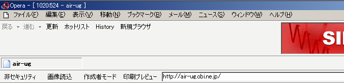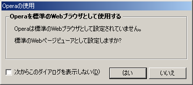 オペラを起動すれば、こんなウィンドウが出てきます。迷わず「はい」を押しましょう。というのは冗談ですが、ここで「はい」を押しても困ることはないでしゅう。基本的な機能はIEとほぼ同じですし、使いにくいとか操作方法などが違いすぎるということはありません。IEを数年間使い続けた男がOperaに乗り換えて困ったことはありませんから。たまにサイトの表示がIEと違うとき(崩れるといった事は今のところありません。ただCSSなどで一部表示が違います。)があるぐらいで、実用性は同じです。