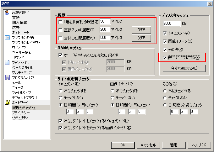 まずは赤枠で囲んだところに注目です。履歴の下に「進む・戻るの履歴」「直接入力の履歴」「全体の訪問履歴」とあり、それぞれ50から500ものアドレスを、記憶してしまいます。これでは自ら火に飛び込むようなもので、危険極まりないのでチェックボタンをはずしましょう。こうすることにより、履歴からあなたがエロサイトに行ったことがバレル心配がなくなりました。さらに念には念を入れて、ディスクキャッシュも消しておきましょう。これはディスクキャッシュ量を減らせばいいのですが、それではサイトを回る際にちょっとした弊害が出てくるので「終了時に空にする」にチェックを入れておきましょう。こうする事で、あなたがどんなサイトに行っていたのかが、バレル心配はなくなりました。