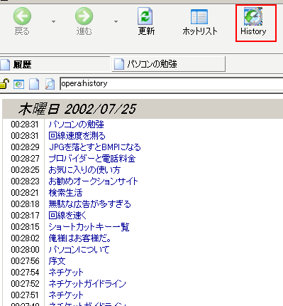 存分に回ってください。そして気になるのが「エロサイトを回った証拠が、他人に漏洩しないか」と一点だと思います。しかもOperaでは親切丁寧にあるサイトに何年何月何日の何時何分何秒に行ったというも分かります。これでは非常に危険ですので、どうにかしましょう。とはいえ設定で簡単にばれないように出来ますので、ご心配なく。ちなみに下の画像(履歴)はメインバーのHistoryをクリックすれば出てきます。