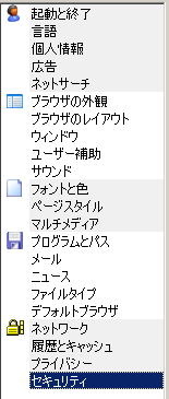 「起動と終了」で起動時にどのページを開くか選べます。ホームページを開いたり、ウィンドウを表示させずに起動したりとありますが、その中で目に付くのは「前回終了時の場所から続行する」というのがあります。こいつは前回開いていたページを記憶して、再起動時に同じページを開くという便利な機能なのですが、逆に言えば自分の秘密がばれると言うわけになりますので、ご家族がおられる方などは、あまりこの機能を使わない方が無難かと思います。他の「言語・個人情報・広告・ネットサーチ」に関してはノータッチ。