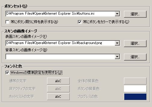 さて肝心のスキン変更方法ですが「ファイル→設定→ブラウザの外観」(またはメインバーで右クリックして、ブラウザの外観でもオッケー)で、下の画像と同じウィンドウを出してください。そして「ボタンセット」の所に「選択」ボタンがありますので、こいつをクリックして、上記でDLしたスキンのフォルダを開き、中にある***.INIファイルを選択すればオッケーです。