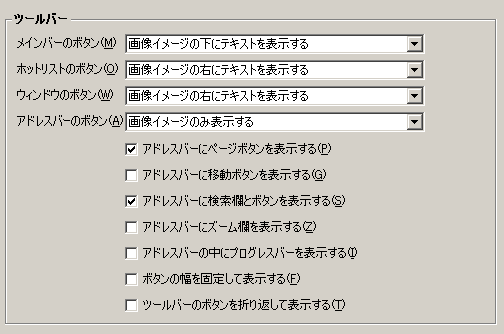 各ボタン(メインバーやアドレスバーなど)などに対する、テキスト表示位置の指定がここで出来ます。「テキストのみ表示」を選べば、名前の通りテキストのみ(戻る・History)表示して「画像イメージのみ表示」なら画像のみ表示します。ここでは各ボタンの表示方法を変えるのみですが、というか変えるだけですが、それでも結構効果があります。テキストのみ表示なら簡素な感じになりますし、画像イメージの右に表示すれば、デフォルトとは違った味が出ています。各人の好みでどうぞ。
