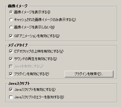 ここでいじっておきたい設定は、画像の表示を許可するかしないか、それとJavaスクリプトを有効にするかしないか、の二点に絞られます。ほとんどの人は画像を表示させると思いますので、問題は無いのですが、javaスクリプトが少し問題になります。ドーナッツRなどであれば、JavaのON/OFFはボタン一つで切り替えられるのですが、Operaではそうもいきません。というのもOperaにはJavaの切り替えボタンがついておらず、ON/OFFの切り替えはこの設定ウィンドウから行うか、もう少し簡単にするのなら「ファイル→クイック設定」からOn/Offの切り替えを行うしかありません。クイック設定を使えば、かなり早く切り替えが行えるのですが、それでもドーナッツRに比べると面倒くさいですね。この短所の為に、ドーナッツRなどからOperaに乗り換えるのをためらう人もいるかも。