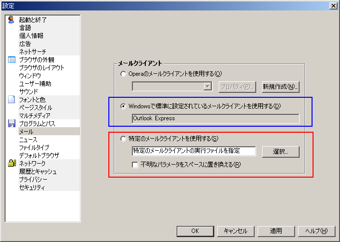Outlook Expressを使っている人は青枠で囲んだところのチェックボックスにチェックを、それ以外のメーラーを使用している人は赤枠で囲んだ所、そのメーラーを指定する(メールソフトの実行ファイルを指定)。またOperaのメーラーはあまり使用しない方が良いかと。それにOperaはブラウザ一直線でいって欲しい。余分な物は取り除いて。