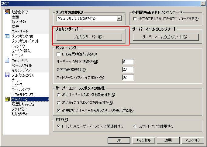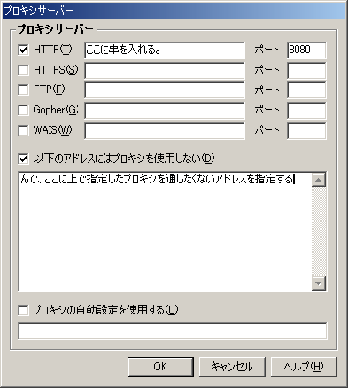 最後になりましたが、ネットワークの設定です。とはいっても特別な設定をするわけでもなく、ちょっと便利な機能があります。まずは赤枠で囲んだ所である「プロキシサーバー」をクリックしてください。すると出てくるのが下の画像。ここでは各ポートにアクセスする際に通す串を設定する事が可能で、更に「以下のアドレスにはプロキシを使用しない」の所にアドレス(air-ug.obi.ne.jp/やyahoo.co.jp/など)を指定することで、そのアドレスには串を通さずに、生で行きます。これが結構使えて、プロキシ規制しているサイトなどに使えば、いちいち串を切り替える必要もなくなります。