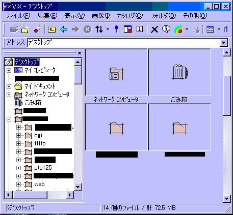 という訳でエロ画像を持っている人は沢山いると思いますが皆さんはその画像を見るときは、どのようにして見ていますか? 一つ一つ見ている人がほとんどだと思われますが、 一つずつ開いて見ると非常に手間が掛かりますし、何より面倒くさい。しかし世の中には便利なソフトがありまして 画像を一括表示してくれるソフトが存在します。 ぶっちゃけた話物凄く見やすいです。 Windows2000/Meを使っている人なら画像ファイルが置いてあるフォルダの 「メニュー→表示 →縮小版」を選択すると画像がサムネイルで表示されますが Windows98にはその機能は付いていません。それでも画像が置いてあるフォルダで 「右クリック→プロパティ→縮小表示を使用」にチェックを入れたら何とか使用可能になります。 (それでも変化がない方は「メニュー→表示→最新の情報に更新」をクリックして下さい。 それでもダメな場合があります。原因としては画像の量が多すぎる事みたい。) 以上の機能でも十分なのですが、ここでは専用のビューワソフトを使用してみましょう。 今回は「ViX」というソフトを紹介します。またベクターで探すのも良し、という事でこちらからどうぞ。 ViXはもっとも知られている画像ビューワソフトの一つでサムネイル表示の他にも 色々な機能が塔載されており、使いやすいのでお勧めです。