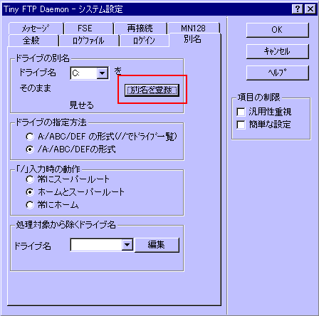 赤枠で囲んだ「別名を登録」を押すと出てくるウィンドウの「隠す」にチェックを入れてください。これでドライブ名がクライアントに知られずに済みます。