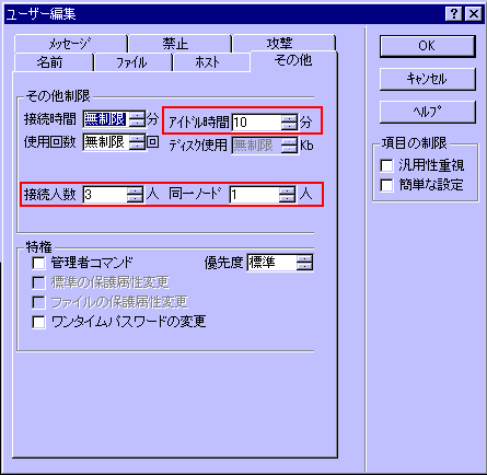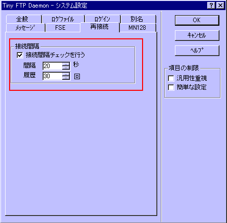「接続間隔チェックを行う」のチェックボックスにチェックを入れる。「間隔」は指定した秒数以下の同じユーザーからの接続を拒否します。「履歴」は接続制限を記録容量で、小さすぎても大きすぎてもいけません、デフォルトの30にしておきましょう。間隔は30秒ぐらいでいいのではないでしょうか。ただしあるユーザー(A)が接続ミス後、20秒後に再接続を試みるとします。すると経過時間が0にリセットされてもう一度30秒待たないといけない事になりますので、read me.txtにその旨を明記しておいた方が良いかもしれません。30秒という具体的数値ではなく、連アタはサーバーの設定で排除しているよ。というような感じで。