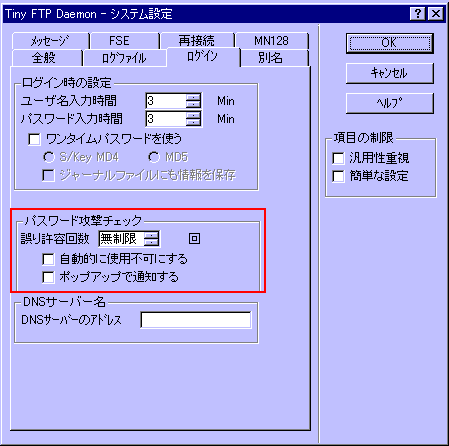 適当にパスワードを入力して進入しようとする輩がいたら「ログイン」の所のパスワード攻撃チェックを変更しましょう。これは指定した回数以上パスワードを間違えた場合、そのユーザーのログインは一切見とめないようにします。銀行のカードで3回暗証番号を間違えたらカードが利用できなくなるのと一緒です。デフォルトでは無制限(つまりはチェックしない)になっていますので、これを「3」に変更しましょう。んで「自動的に使用不可にする」にもチェックを入れる。