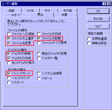 説明するほどでもありませんので、Put自体の説明は無し。ただanonymousでログインした人とファイル交換などの交渉が成立していないのにPut出来るように設定していると、ウイルスを上げたり要らないフィアルを上げてくる人もいます。anonymousでログインした人と交渉が成立した場合のみ、アカウントを作成してPutを許可する方がセキュリティー面で安全かもしれません。アカウントの作成は後で説明するとして、Put・Getの権限などの各種設定をいじってみましょう。