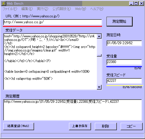 これが実行後の画面です。見た感じシンプルですが使い方もものすごくシンプルで http:// から始まるアドレスを入れて(私の場合はヤフーで試しました)測定開始を押すだけです。