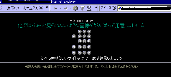 分かりますか?バナー広告が表示されなくなりました。 これで表示スピードも上がりました。 また視覚的に邪魔な広告も消し去って一石二鳥です。 話しは変わってバナー広告をJAVAを切って、上記のような回線速度を上げるソフトを使用しても回線を遅くする根本的な問題が残っています。 それは今見ているサイトです。あなたは経験がありませんか? あるサイトにいくと大きくて重い画像(容量の多い事)が張ってあり、バックには音楽が流れ スクロール文字が幾つも流れ、GIFによるアニメーションが流れているサイトを・・・・・・ これは極端な例ですが、表サイトに行くとこのようなサイトを良く見かけます。 サイトを作るのに、ついつい手を加えていってしまう気持ちはわかりますが、上記の様な事をするとトンでもない事になります。 ちょっくらそんなヤバイページを作ってみましたので、どんなものなのか 知りたい方はこちらからお入りください。 ただでさえ回線が細いのに、こんなサイトに行くと絶対二度と足を踏み入れる事はないでしょう。