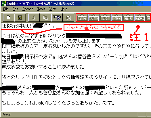 なんて具合に直してくれます。一部直ってないところもありましたがこれぐらいなら大丈夫なレベルです。 本当にめちゃ簡単な操作なので、今まで文字化けメールはごみ箱行きだった人は是非試して下さい。 んで、右上の方に「注1」とありますが、そこで囲んでいる赤枠の中にボタンが並んでますよね。 文字化けといっても化け方に種類が幾つかあるみたいで、もし文字化けが直らなかった場合は 赤枠の中のボタンを片っ端からクリックしていくと、大抵の場合は文字化けが直ります。
