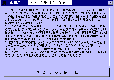 どなたも簡単に難しい設定を必要とせず、国際電話回線を利用してインターネットに接続できます。 18歳未満の方はご利用できません。 本プログラムは専用線、LAN環境で接続されてるものではご利用になれません。本プログラムが直接的または間接的に損害を生じさせても、著作者は一切の責任を負いません。また、機器や媒体が原因の損害につきましても、著作者は一切の責任を負いません。したがって著作者は本プログラムに関する保証も行いません。さらに本プログラムを使用した結果の影響に関しても一切の責任を負いません。本プログラムでの接続は、国際電話回線を利用しています。御利用時には6秒あたり最高40円の通話料金がかかりアクセスポイントまでの通話料がかかります。御利用が終わりましたら必ず接続をお切り下さい。(接続中は通話料及び情報料がかかります。)本プログラムを起動すると、プログラムの性質上ダイヤルアップの標準(デフォルト)の接続先の電話番号が国際電話回線の番号へと変更されます。当方が提供するサービスへのアクセスを終了し、次回以降インターネットを御利用になる際は、必ず変更されたダイヤルアップの標準(デフォルト)の設定先の電話番号をご自分で契約されているプロバイダの電話番号へとお戻しください。元に戻さずそのまま御利用しますと上記の通話料、及び情報料がかかります。必ず接続先の設定を元にお戻し下さい。(接続ウイザードやダイヤルアップ設定等でインターネットの接続先を、普段御利用のプロバイダー等のアクセスポイント等に戻して下さい。詳しくは、お使いのコンピュータやソフトウェア等の取り扱い説明書等を御参照下さい。)また、接続を開始(ページ内ボタンをクリック)することによって以上の内容に同意したことと見なしますのでご注意ください。