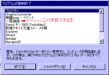 面白い事に「同意しない・閉じる」というのがありません。右上の×を押してもいいのですが、それは怖いので「Ctrl+Alt+Del」で強制終了させましょう。ちなみにこいつのプログラム名は「一発接続」です、覚えておきましょう。んで「Ctrl+Alt+Del」を押したら出てくるのがこれ。