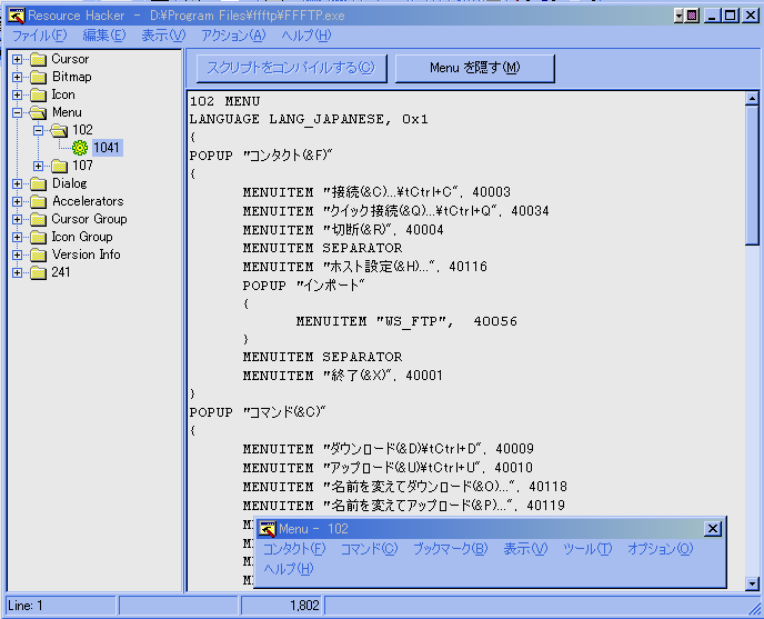 例えばFFFTPのメニューに表示される文字を変更したければ、「Menu→102→1041」を選択し、右のウィンドウに表示された文字列の中から、変更したい言葉を探します。見付かったら直接変更してください。