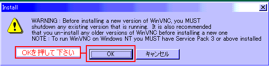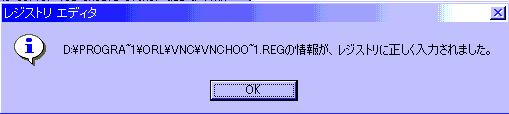 これでインストールは完了です。しかしこれで終わりというわけでは無く、少しやる事があります。 「スタート → プログラム → Vnc → Administrative Tools → Install Default Registry Settings」とすればしたようなウィンドウが出てきます。