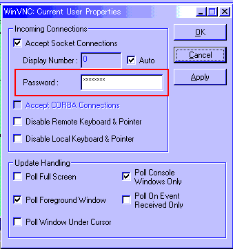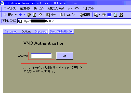 たとえば、操作されるマシンが 210.249.3.52 というIPだった場合は http://210.249.3.52:5800 という風になります。最後の5800はWinVNC用のポートだと思います。うまくいけば下の画像のように、パスワードを要求してきますので先ほど設定したパスワードを入力しましょう。そうするとお待ちかねの「リモートアクセス」が可能となります。