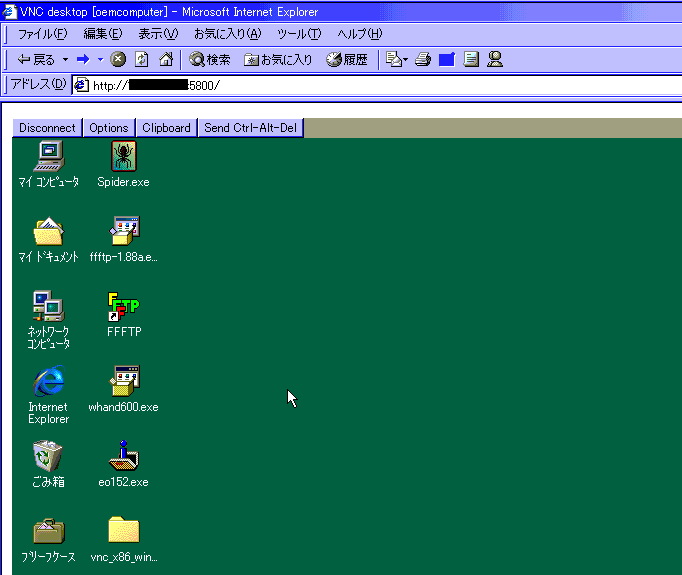 それでパスワードの入力がすめば、下の画像のような感じで操作されるほう(サーバー)の操作が可能です。何でも出来ます。基本的にはマウスを使って行う操作は全てできると思ってください。キーボード入力も可能です。つまり本当に何でも出来ます。それでアドレス欄の下に「Disconnest」「Options」「Clipboard」「Send Ctrl-Alt-Del」と四つのボタンがついています。