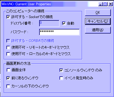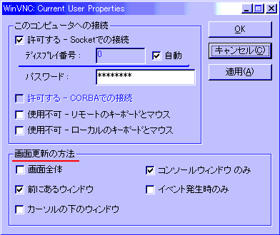 操作される側(サーバー)の設定からいきたいと思います。最近はプロードバンド化が進んでいましたが、私の知人には未だにISDNを使用している男の中の漢がいたりするので、皆様の中にも遅い回線の方は結構いると思います。細い回線だとどんな問題が出てくるのかというと、画面の再描画を行うたびに画面がカクカクしてマウスの動きも変になってしまいます。そんな方は画面の質を落として、代わりに動作性を確保しましょう。下の画像を見てください。赤線を引いたところに「画面更新の方法」とあり、今は「前にあるウィンドウ」と「コンソールウィンドウのみ」にチェックが入っています。これは名前の通り画面の前にあるウィンドウとコンソールウィンドウのみ画面を更新するようになり、「画面全体」を選ぶよりも動作が速くなります。最もケーブル接続の方やADSLといった高速回線の方は「画面全体」で十分だと思います。