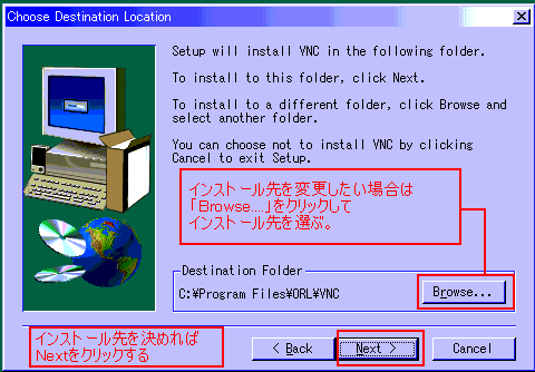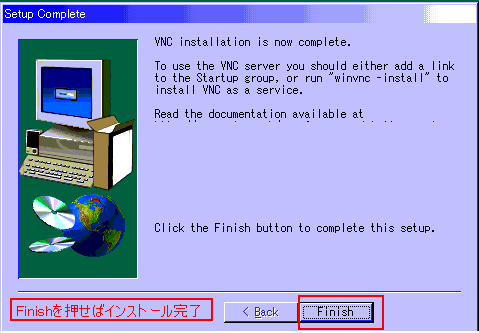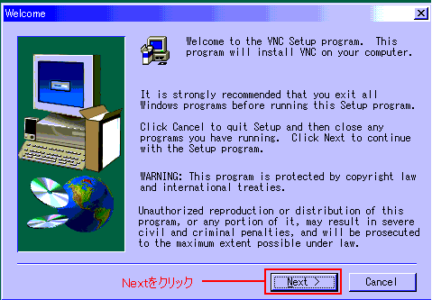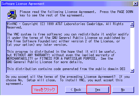 まずはWinVNCというソフトをてに入れてください。 http://www.uk.research.att.com/vnc/ から手に入りますが、ちょっとややこしくなっているので説明します。左のDownLoadをクリックします。すると Your Name: Your email address: Your organisation: Comments: と入力する欄が出てきますが、ここは適当に入れてください。もしあなたがこういったソフトに興味があるのなら、ちゃんと入力する事をお勧めします。
