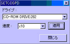 そんな時に「持っていて良かった〜」ってツールがあるので紹介します。 「SetCDSPD」という名のCD-ROMドライブの回転数を制御できるナイスなツールで 下は1倍速から、上は24倍速までありその時の気分に応じて好きな回転数を チョイス出来ます。早速使ってみた感想ですが 「回転数を低く設定したら、CD-ROMドライブの音はかなり静かになった」 と、期待通りの仕事をしてくれました。 下の画像を見たら分かると思いますが、インターフェイスが物凄くシンプルで 使い方も簡単なのでお勧めです。 「SetCDSPD」配布サイトへはToppage(http://hp.vector.co.jp/authors/VA007697/)から行けます。