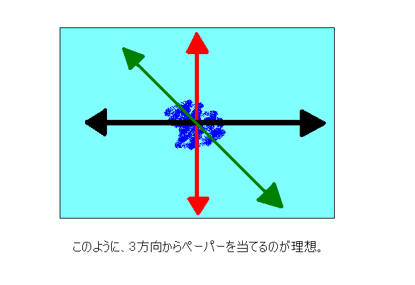 それと削り方にも方法があります。ただ一方方向のみで往復して削っているのでは、傷は消えませんし、ペーパー目(ペーパーを当てた時に出来る傷の事)も残ってしまいます。理想としては3方向から削るのが望ましいです。最初は左右にある程度削ります。その後上下方向にある程度削り、最後は斜め方向に削ります。それを何回か繰り返す事によって、ペーパー目も残りませんし、綺麗にペーパーを当てることが可能となります。下の画像を参考にして下さい。ちなみに青いスプレーは、ペーパーを当てようとしている部分です。