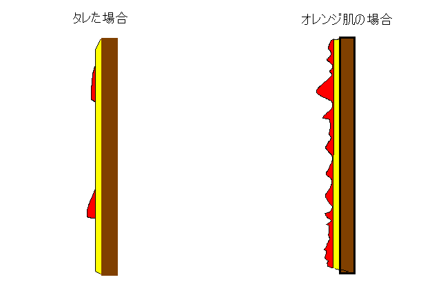 この画像で説明すると、茶色が塗装の対象となる物体・黄色は塗装面を綺麗に見せるためのライン(うまく表現出来なくて、申し訳ない。塗装をミスっても、黄色のラインまで削ったら綺麗になるよ。という意味です)・赤色が塗装のミスにより削り取らないといけない部分になります。タレの場合でしたら、赤色の部分だけを削りとればOKです。しかしオレンジ肌の場合でしたら、ほぼ全面を削り取らないと、塗装面を綺麗にすることは出来ません。