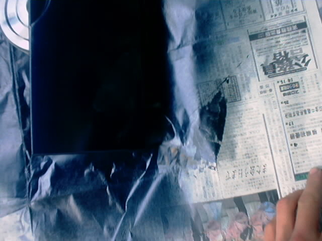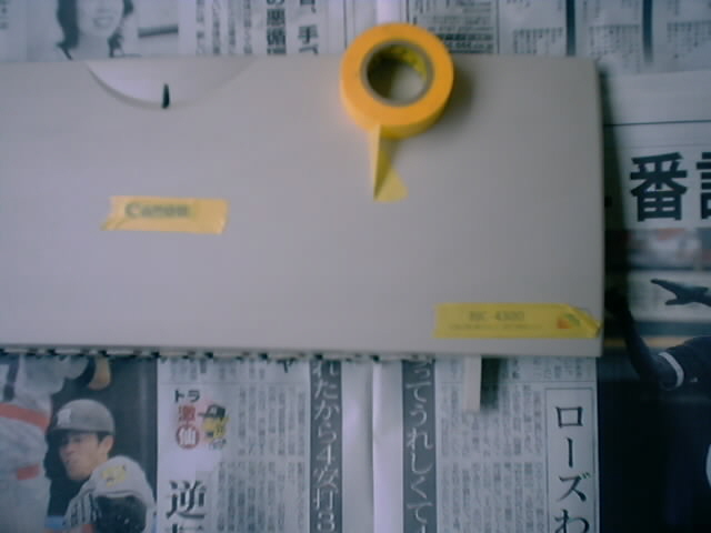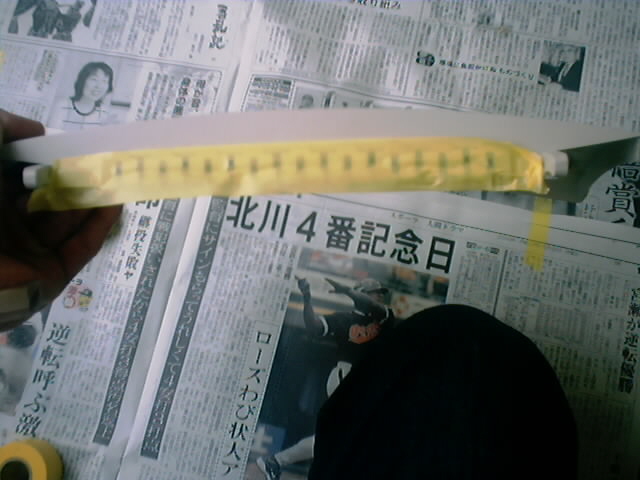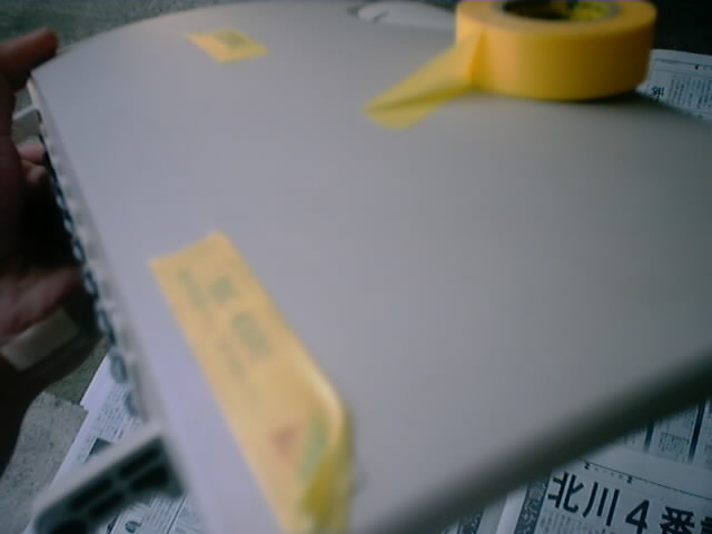 これも塗装前の写真。新聞紙の上の方が黄色いテープで止められていますが、これが噂のマスキングテープです。目的は新聞紙が飛ばれないようにです。