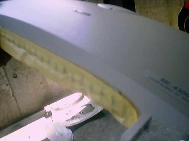 それで写真中央にマスキングテープが変な形で引っ付いていますが、これはちょっとした技(というのも大げさですが)です。マスキングテープを使い終わった後、地面や机に置いていては、また使う際にイチイチ取るのが面倒です。そこでテープを少しだけ出しておいて、近くの壁などに貼り付けておく方法です。車をマスキング中ならドアやルーフなどですね。こうすると一般の人からすれば「おおっ、あいつは結構やるな」という風に見られます。すいません、それだけです。実際テープを使う際に爪で引っ張り出さなくて良いので、使える技です。(説明が上手く出来ませんが、使用前のテープは先端がテープ自身に巻きつけてあり、その先端部分を引っ張り出さなくてはなりません。しかしこの技を使うと、先端部分は既に引っ張り出されているので、その心配がないと言うわけです。)
