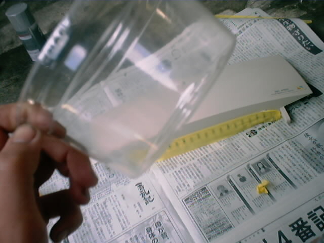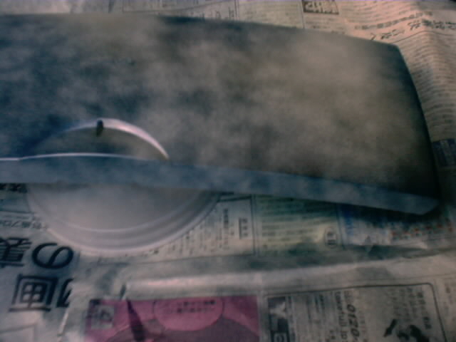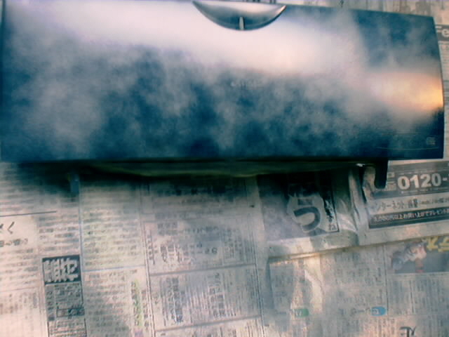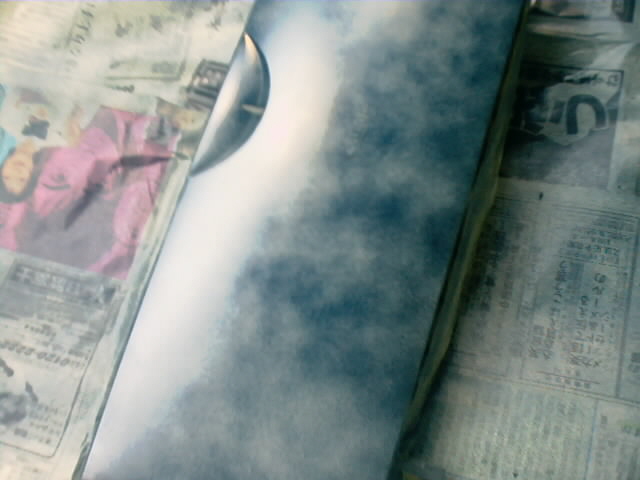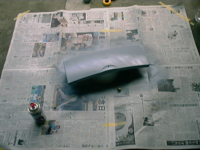 予定では次はクリアを吹き付ける作業に入るのですが、ここで事件勃発しました。地面に敷いた新聞紙なのですが、重りを置いてしっかり固定していたはずなんです。風も結構強く吹いていたので、確かに固定していたはずなんです。しかし上塗り作業が終わって、一服したのが間違いの始まりでした。百聞は一見にしかず・・・・・・