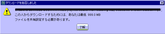 これは相手の設定により、弾かれた場合に出てきます。この場合でしたら相手は「990MB以上」ファイルを共有しなければDLを許可しないようにしています。この場合は素直に諦めるか、がんばってファイルを集めましょう。またファイル容量ではなく、ファイル数でも制限をかけている人もいます。