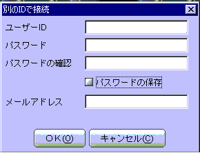 現時点ではまだ、サーバーに繋がっておりません。サーバーに繋ぐ為にはアカウントが必要ですが、そのアカウントを取得するには「ファイル→新しいIDを取得」でオッケーです。その際に下のウィンドウが出てきますので、お好きなIDとパスを指定してください。 「パスワードの保存」は名前の通りで、次に鯖につなぐときにパスを入力する必要が無くなります。とはいえ無くしても新しくIDを取得すれば良いのでさほど神経質になる必要も無いと思います。