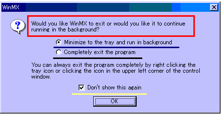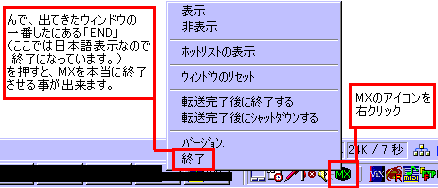 赤色の線で囲まれた所は「MXを終了する時は、どうする?」という意味。 青色は「画面から消すけど、タスクバー内に収容しバックグランドで起動させておく」という意味 黒色は「すぐMXを終了させる」という意味 チェックの入っている白色は「2度とこのウィンドウを出すな」という意味 青色を選べば、右上の×を押しただけでは終了しなくなり、タスクバーに収容されるようになります。 説明すると、右上の×を押しただけではMXを終了できなくなり、タスクバー内で生きているので ポインタをタスクバーに移動してMXのアイコンの上で右クリック 、そして「END」を押して とどめを刺す事が出来ます、つまりプログラムを終了する事が出来ます。 下の絵を見て気がついた人もいると思いますが「バージョン」をここでも見ることが可能です。
