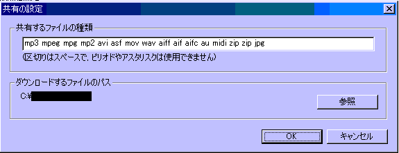 「パスの追加」はあなたの共有するフォルダを追加します。 「パスの削除」は共有するフォルダをパスから削除しますが、HDからは削除はされません。 パスから削除するだけですので、ご安心を。 「ファイルの種類」はあなたの共有するファイルの拡張子を決めるのと、DLするフォルダの指定です ここではあなたの共有しようとする拡張子を入力してください。