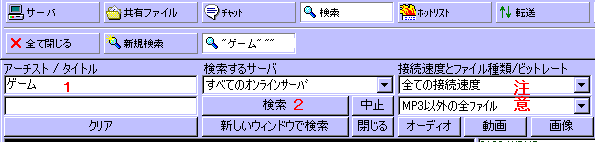 まずは「1」とある所に検索したい文字を入れます。日本語でも英語でもなんでもオッケーです。 んで「2」の「検索」を押せばあとは勝手に検索してくれますが「反応が無いよ」っていう方は サーバーが ちゃんと繋がっているか確認してください。サーバーが繋がっていないと 幾ら検索ボタンを押しても無駄です。その他ではサーバーが繋がっていても反応が無い(正確には遅い) 時もありますので、30秒ほど待ってから検索ボタンを押しなおしてください。