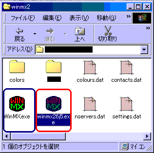 赤色がWinMX日本語化パッチ、青色がWinMXです。このように二つのファイルを 同じフォルダに入れた状態でパッチをダブルクリックすればよいのですが、一つ注意。 実行ファイル(拡張子が.exe)はD&Dではコピー出来ずにショートカットを作成します。 んで、さらに物凄く注意する事があるのですが、それはWinMXを終了している事。 これを見て早速終了しようと思った人。右上の×ボタンを押したら変なウィンドウが出てきましたね。