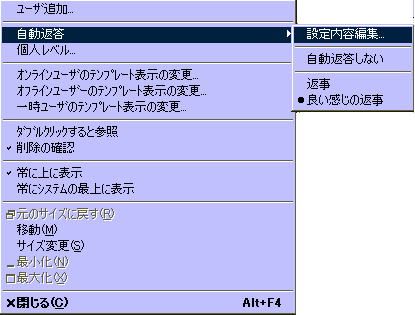 すると出てきたのが、こんなウィンドウ。その中から「自動返答→設定内容編集」と選んでください。そうすると出てくるのが下のようなウィンドウ。